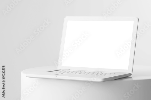 The watermark will not be included on Wall mural.: Grey clay minimalist style of a notebook laptop in perspective view on circular podium product displ