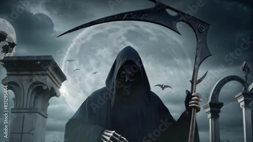 Wall mural : Grim reaper holding a scythe full moon 4k loop features an a - i - generated video of a skeletal grim r