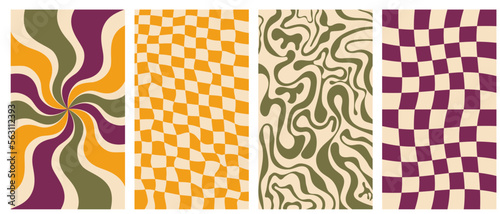 Wall mural groovy hippie 70s vector backgrounds set. chessboard and twisted patterns. backgrounds in trendy ret