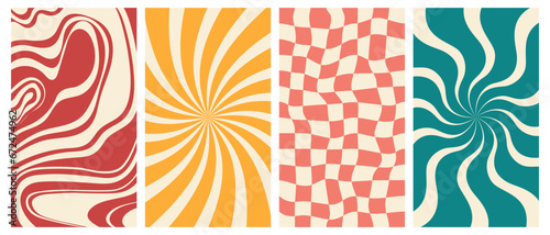 Wall mural groovy hippie 70s vector backgrounds set. chessboard and twisted patterns. backgrounds in trendy ret