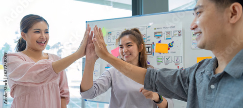 Wall mural : Group of designer cheerful giving high five on the success of website design and application on mobi