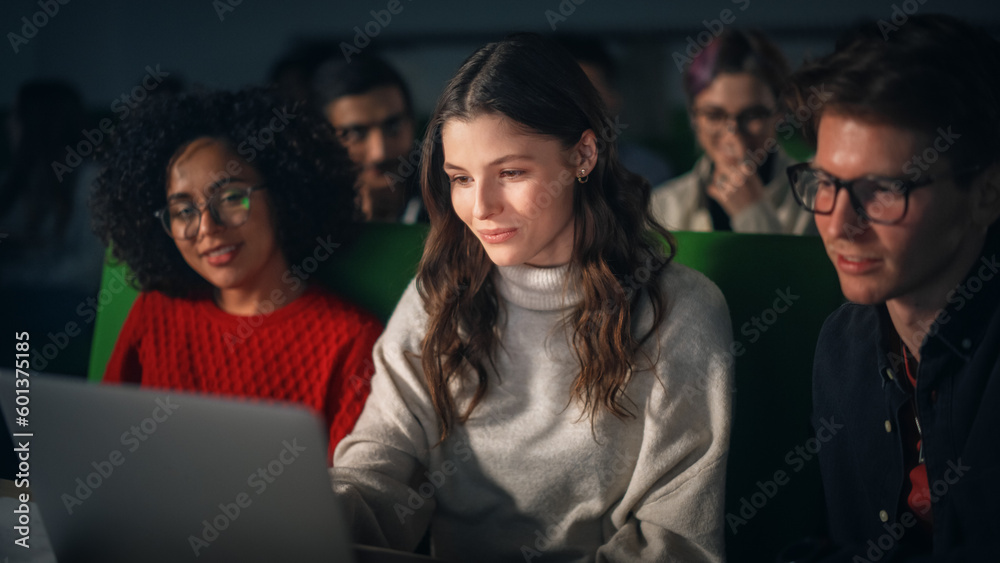 The watermark will not be included on Wall mural.: Group of diverse happy students having a conversation in university classroom, working on a shared r