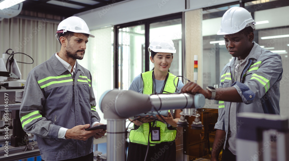 The watermark will not be included on Wall mural.: Group of diverse people working on robot programming in robotic and electronic engineering laborator