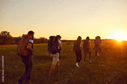 The watermark will not be included on Wall mural.: Group of five people with large backpacks move in a row across a field at sunset -
