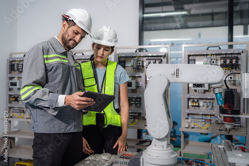The watermark will not be included on Wall mural.: Group of hispanic people working on robot programming in robotic and electronic engineering laborato