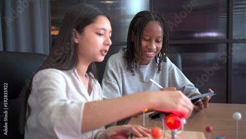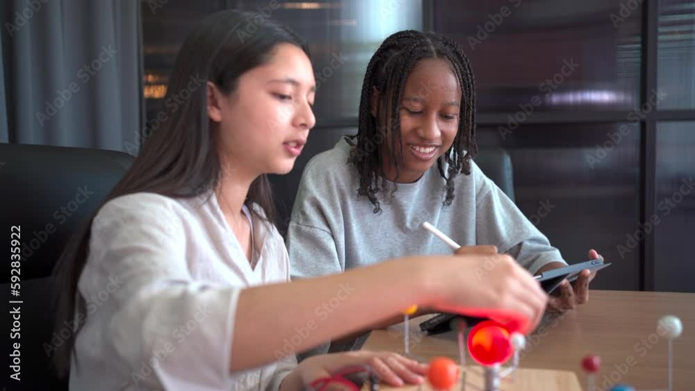The watermark will not be included on Wall mural.: Group of primary school student enjoy learning and discussing about astronomy science together in cl