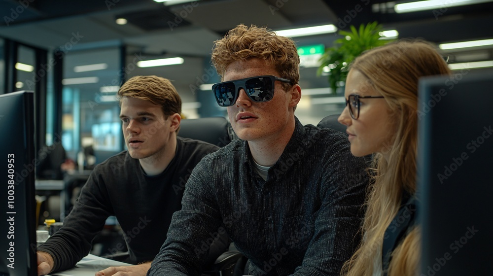 The watermark will not be included on Wall mural.: Group of professionals in an office setting collaborating on a project including a colleague with a