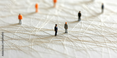 Wall mural : Group of simple miniature people shapes connected by thread lines on a simple background - wallpaper