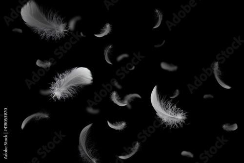 Group of soft and light white feathers floating in the dark - feather abstract on black background - Wall mural