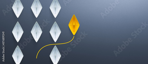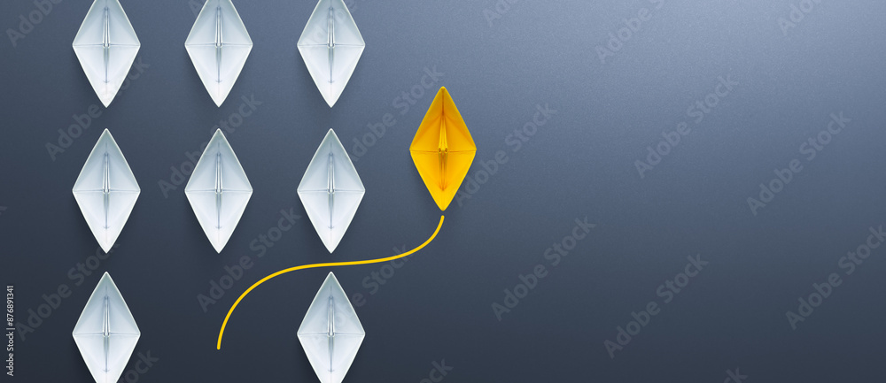 Wall mural group of white paper ships in one direction and one yellow paper ship pointing in different way. bus