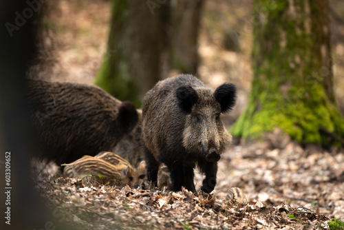 Wall mural : Group of wild pig in the spring forest - wild sow with small piglets in the wood - european wildlife -