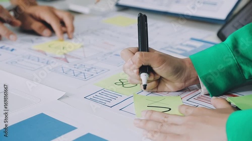 The watermark will not be included on Wall mural.: Group of young application developers analyzing uxui mobile app templates during a working meeting