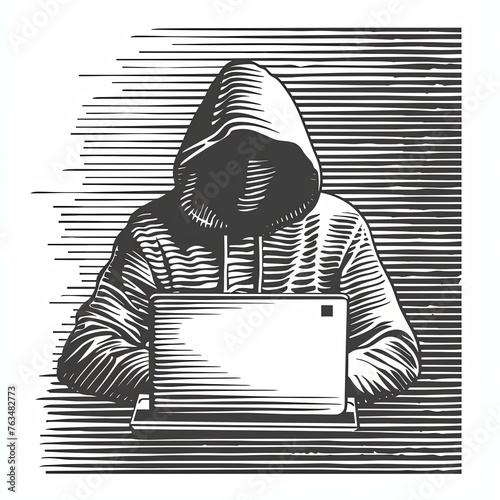 Wall mural guy hacker sits at a table in front of a laptop on a dark background. the man is stealing data. the  - Wall murals Wall mural guy hacker sits at a table in front of a laptop on a dark background. the man is stealing data. the - Wall murals