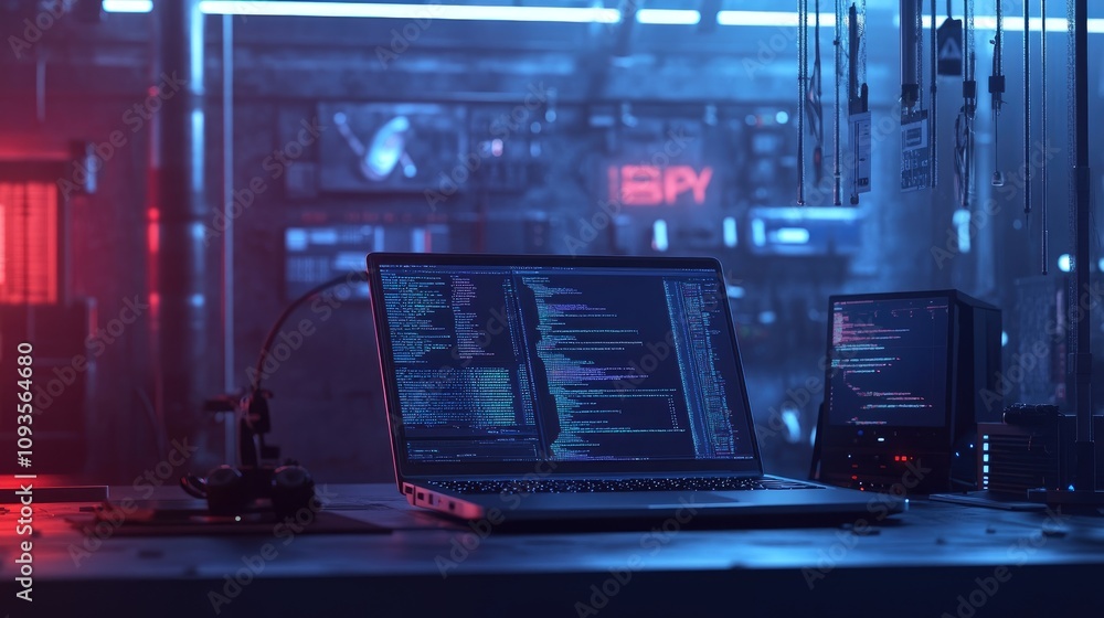 The watermark will not be included on Wall mural.: Hacker's laptop with code on screen in a dark room -