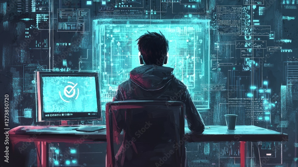 Wall mural hacker analyzing digital data streams on computer screen - Wall murals Wall mural hacker analyzing digital data streams on computer screen - Wall murals