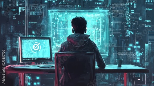 The watermark will not be included on Wall mural.: Hacker analyzing digital data streams on computer screen