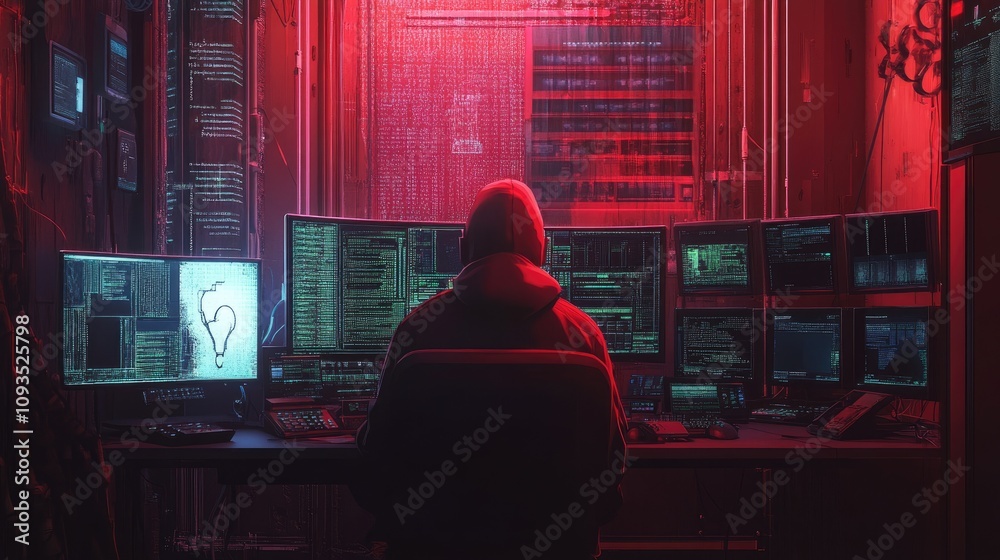 The watermark will not be included on Wall mural.: Hacker at work in a dark room with multiple monitors displaying code -