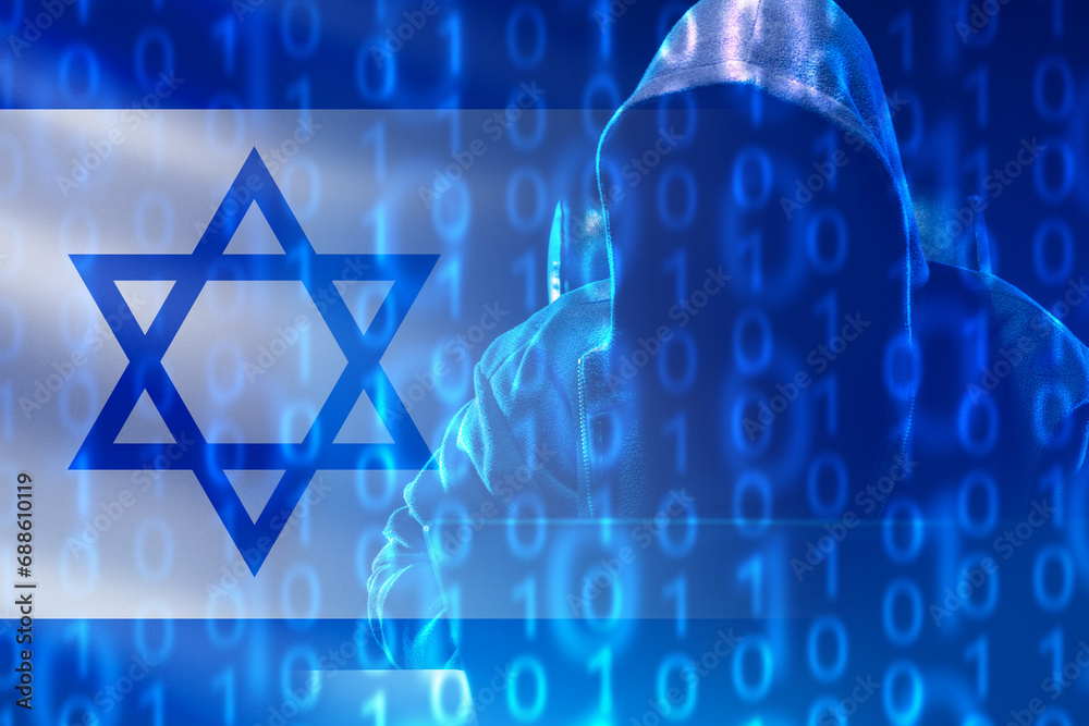 Hacker from israel - man in hood with laptop - israel flag with binary code - cybersecurity - hacker worWall mural