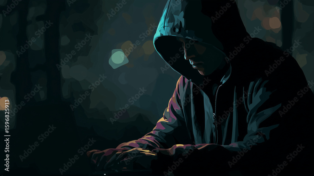 Wall mural : Hacker in a hoodie typing code in a dark environment, security in internet, vector style