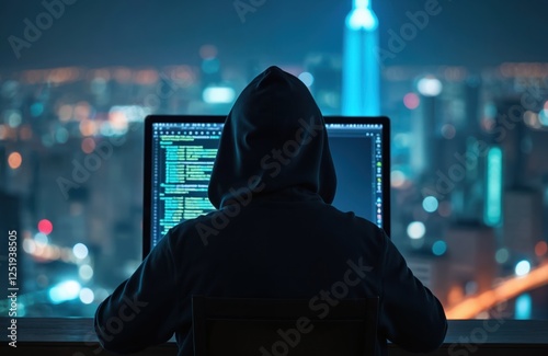 Wall mural : Hacker in hood sits at computer, coding at night - cybercrime concept, visual metaphor for online sec