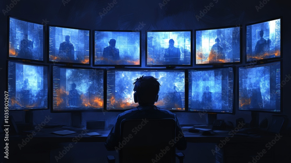 Hacker monitoring multiple screens with digital data and codeWall mural
