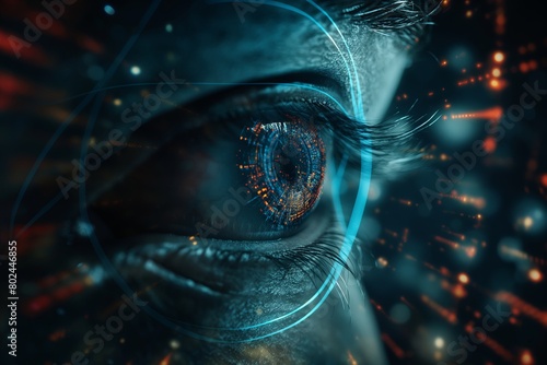 Wall mural hacker or ai robot eye in dark tech space, cyborg vision on digital background. concept of cyber sec