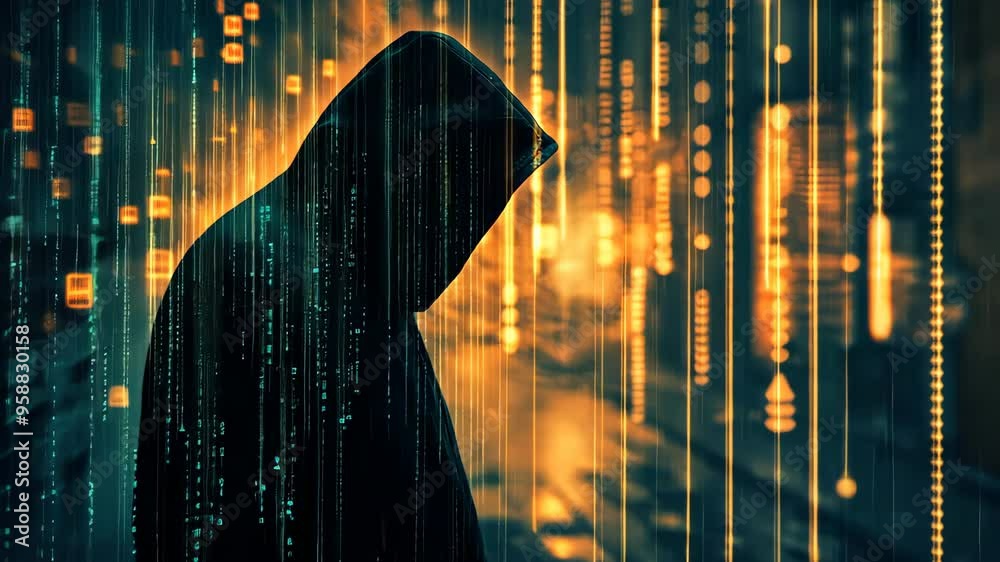 Wall mural hacker standing with falling code in server room - Wall murals Wall mural hacker standing with falling code in server room - Wall murals