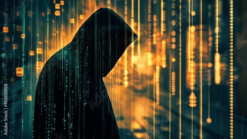 The watermark will not be included on Wall mural.: Hacker standing with falling code in server room