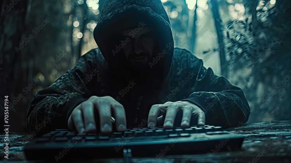 Wall mural hacker using laptop. lots of digits on the computer screen.
