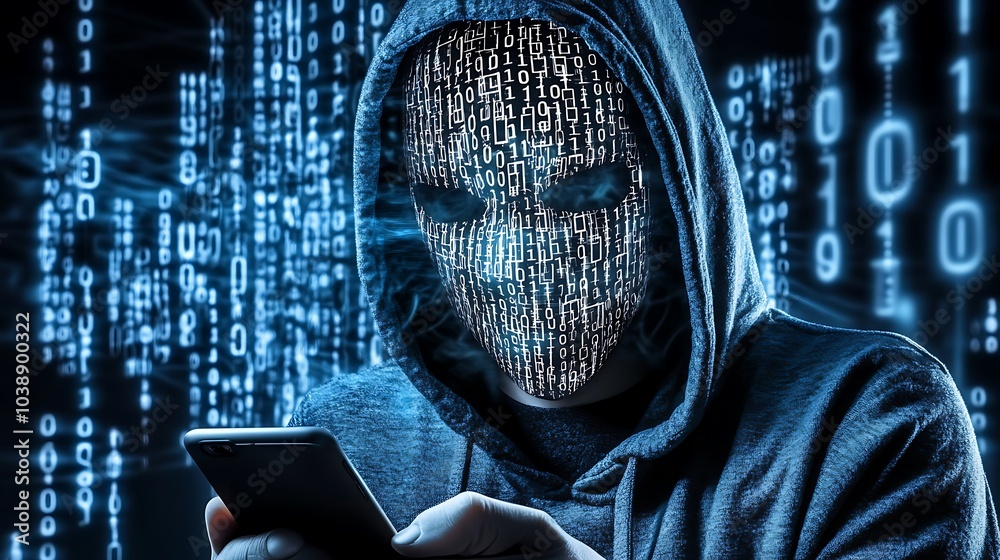 Wall mural hacker wearing white mask with binary code digital interface using smartphone to steal financial dat - Wall murals Wall mural hacker wearing white mask with binary code digital interface using smartphone to steal financial dat - Wall murals