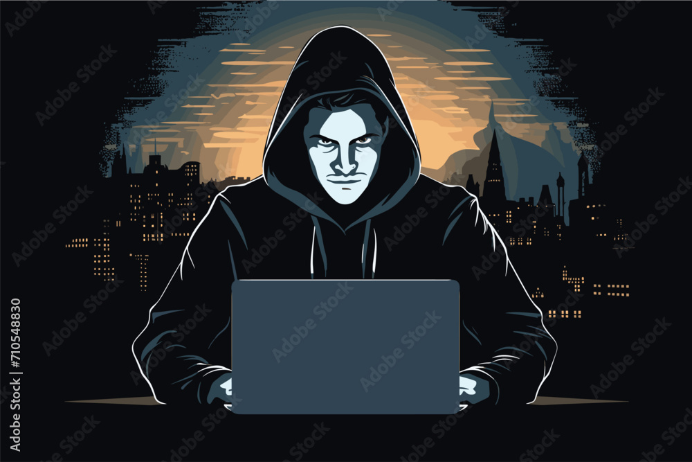 The watermark will not be included on Wall mural.: Hacker writing binary codes in the dark web, computer hacker silhouette hoodie and mask hides his fa