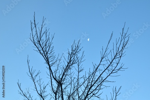 Wall mural half moon floating on sky with blurry silhouette tree background in morning - Wall murals Wall mural half moon floating on sky with blurry silhouette tree background in morning - Wall murals