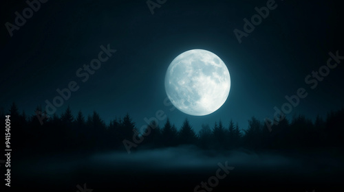 Wall mural halloween full moon shining over dark forest with silhouettes of gnarled trees and mist rising from