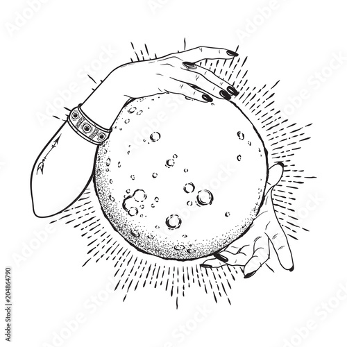 Wall mural hand drawn full moon with rays of light in hands of fortune teller line art and dot work. boho chic