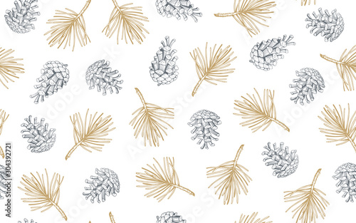 The watermark will not be included on Wall mural.: Hand drawn seamless pattern with pine cones and branches - vector