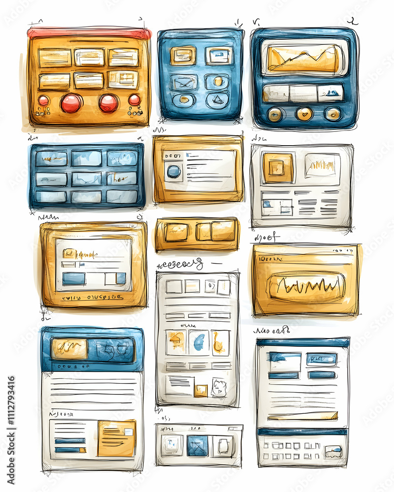 The watermark will not be included on Wall mural.: Hand-drawn sketches of various website and app interfaces -