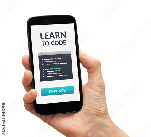 Wall mural : Hand holding a black smart phone with learn to code concept on screen - isolated on white background