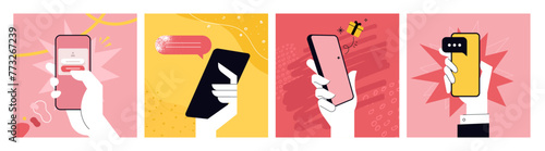 The watermark will not be included on Wall mural.: Hand holding and using mobile phone - set of vector illustrations for graphic and web design of busin