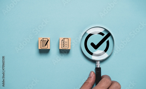 Wall mural : Hand holding magnifier glass with correct sign mark next from document icon for documentation prepar