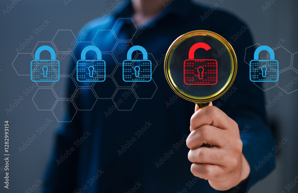 Wall mural : Hand holding magnifying glass, security engineer identifying data security vulnerabilities in intern
