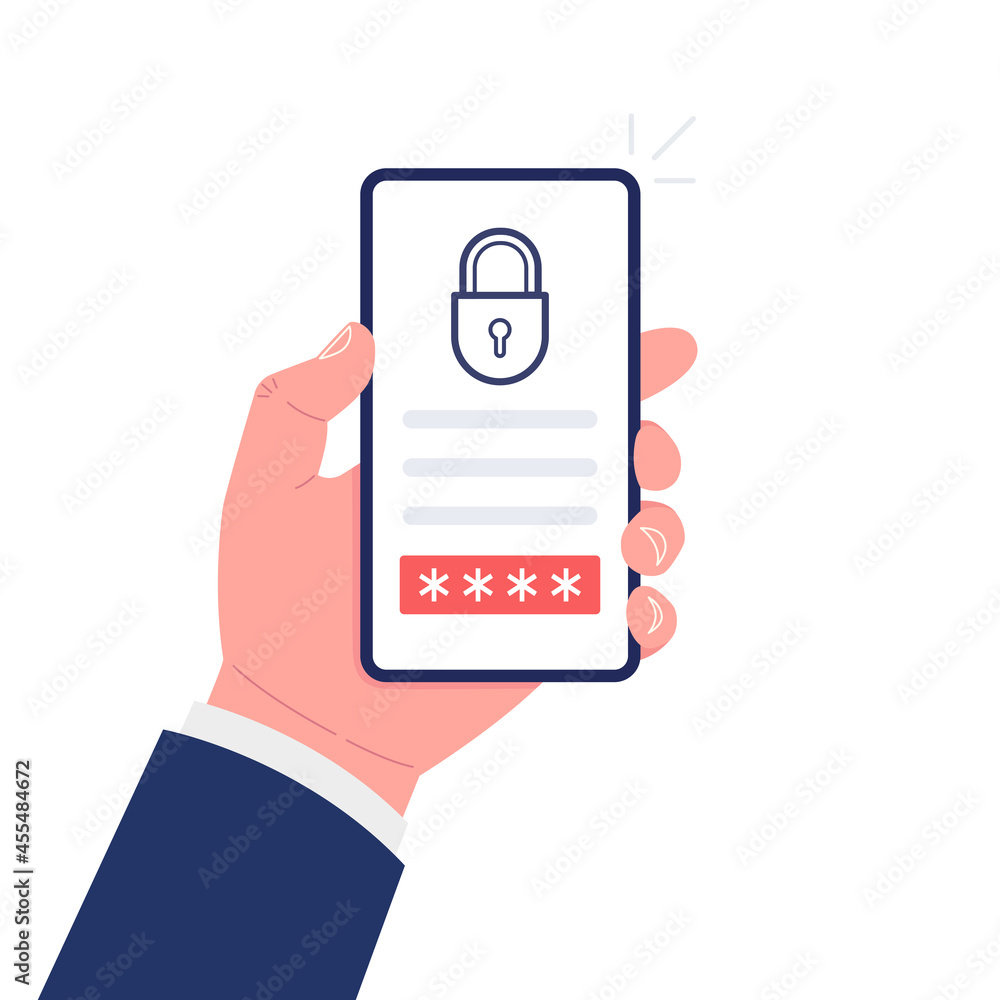 Wall mural hand holding smartphone with lock and button on the screen. mobile security concept. vector illustra - Wall murals Wall mural hand holding smartphone with lock and button on the screen. mobile security concept. vector illustra - Wall murals