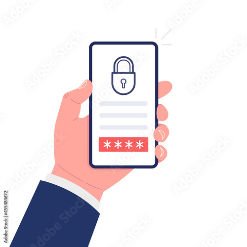 The watermark will not be included on Wall mural.: Hand holding smartphone with lock and button on the screen - mobile security concept - vector illustra