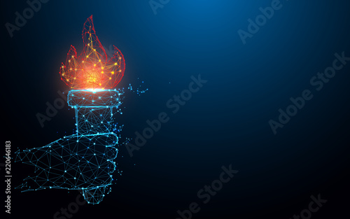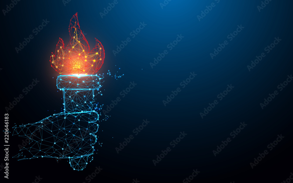 Wall mural : Hand holding torch flame form lines, triangles and particle style design - illustration vector