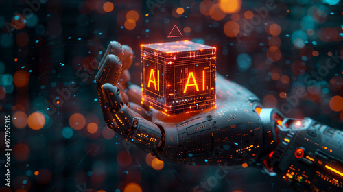 Wall mural : Hand holds a glowing cube with the inscription "ai" on the palm - artificial glow with artificial int