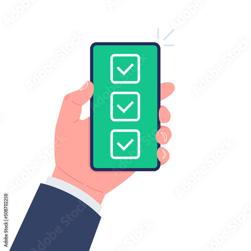 Hand holds the smartphone with green checkboxes on screen - vector illustration - - Wall mural