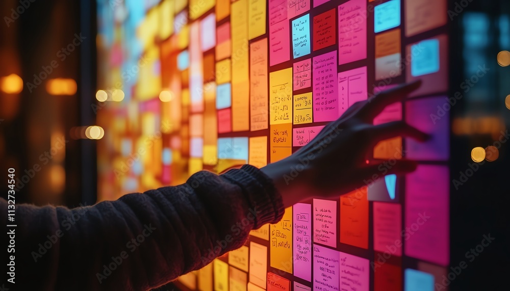 The watermark will not be included on Wall mural.: Hand hovering over a digital screen filled with sticky notes and colorful data, illustrating a digit