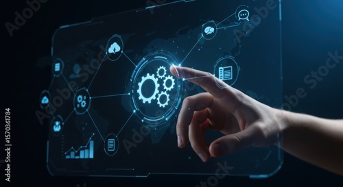 The watermark will not be included on Wall mural.: Hand interacting with a futuristic digital interface displaying a network of gears and data