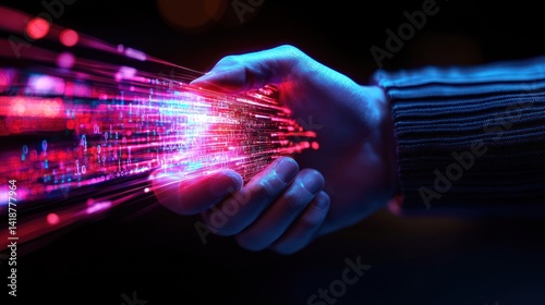 The watermark will not be included on Wall mural.: Hand interacting with digital data streams in a dark environment