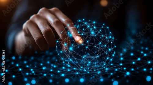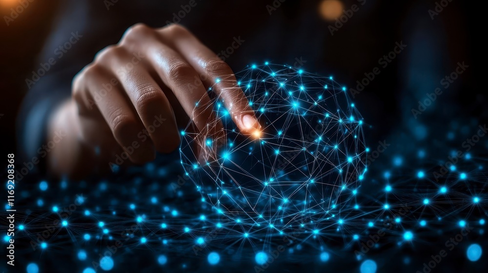 Wall mural hand interacting with illuminated global network digital connection abstract technology - Wall murals Wall mural hand interacting with illuminated global network digital connection abstract technology - Wall murals