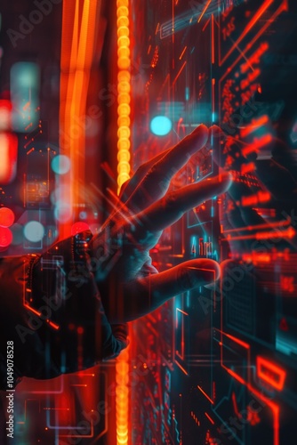 Wall mural hand is reaching out to touch a computer screen with a red background. concept of curiosity and expl - Wall murals Wall mural hand is reaching out to touch a computer screen with a red background. concept of curiosity and expl - Wall murals